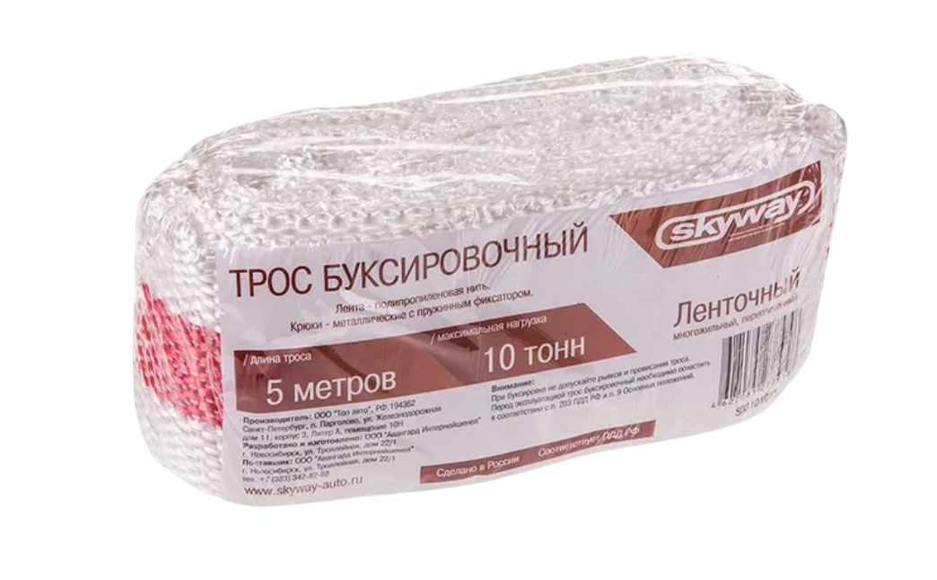 —Трос буксировочный 10 т 5 м SKYWAY 2 крюка, ленточный, в пакете